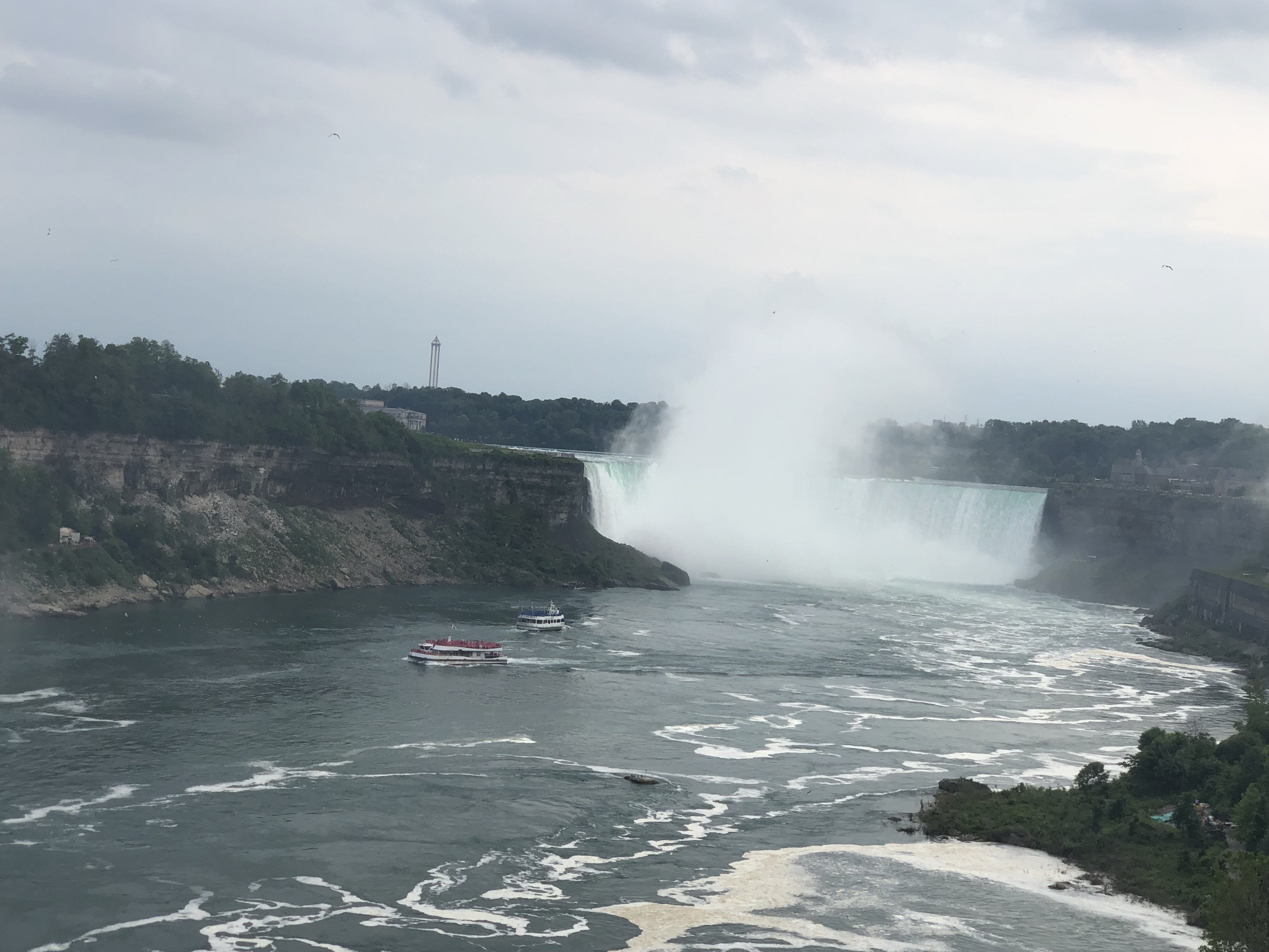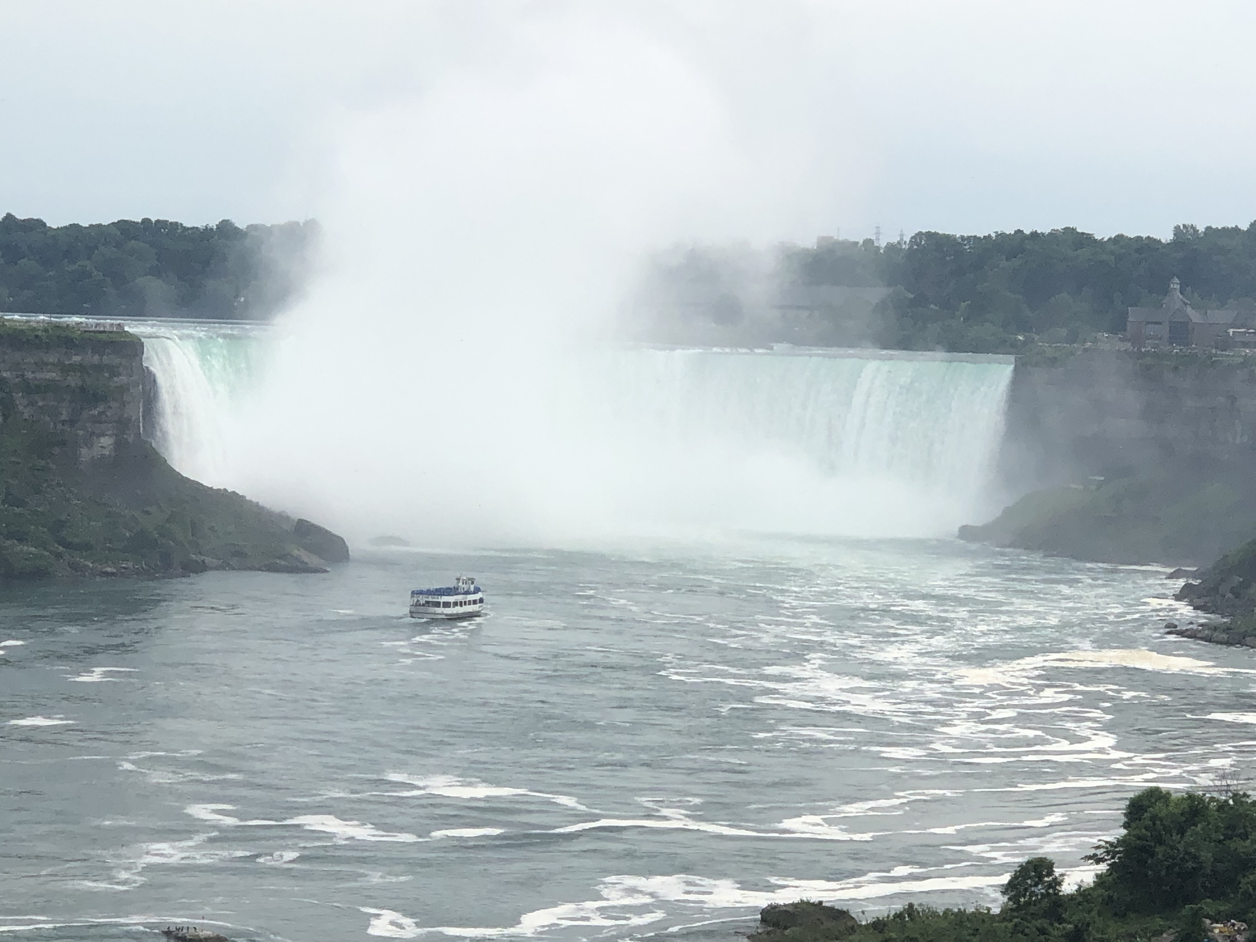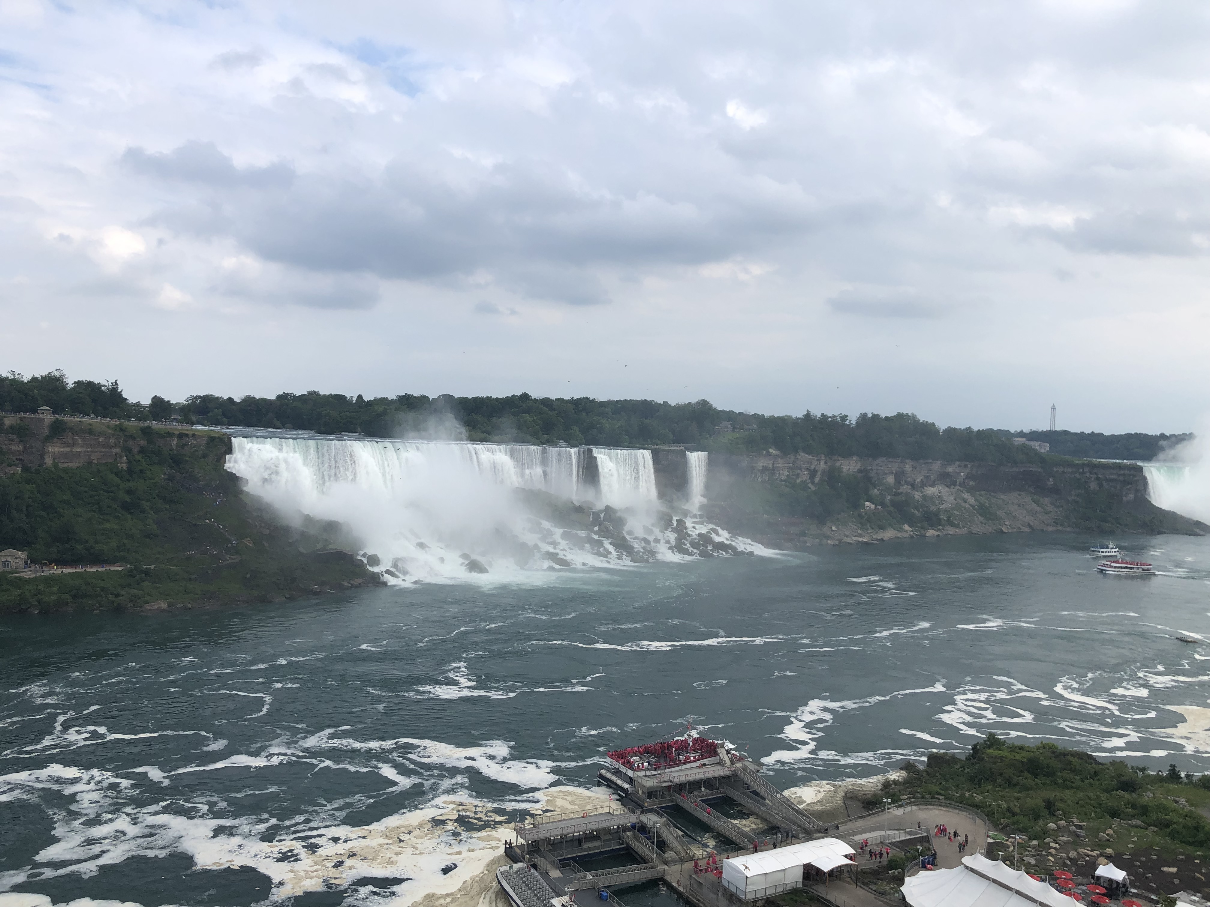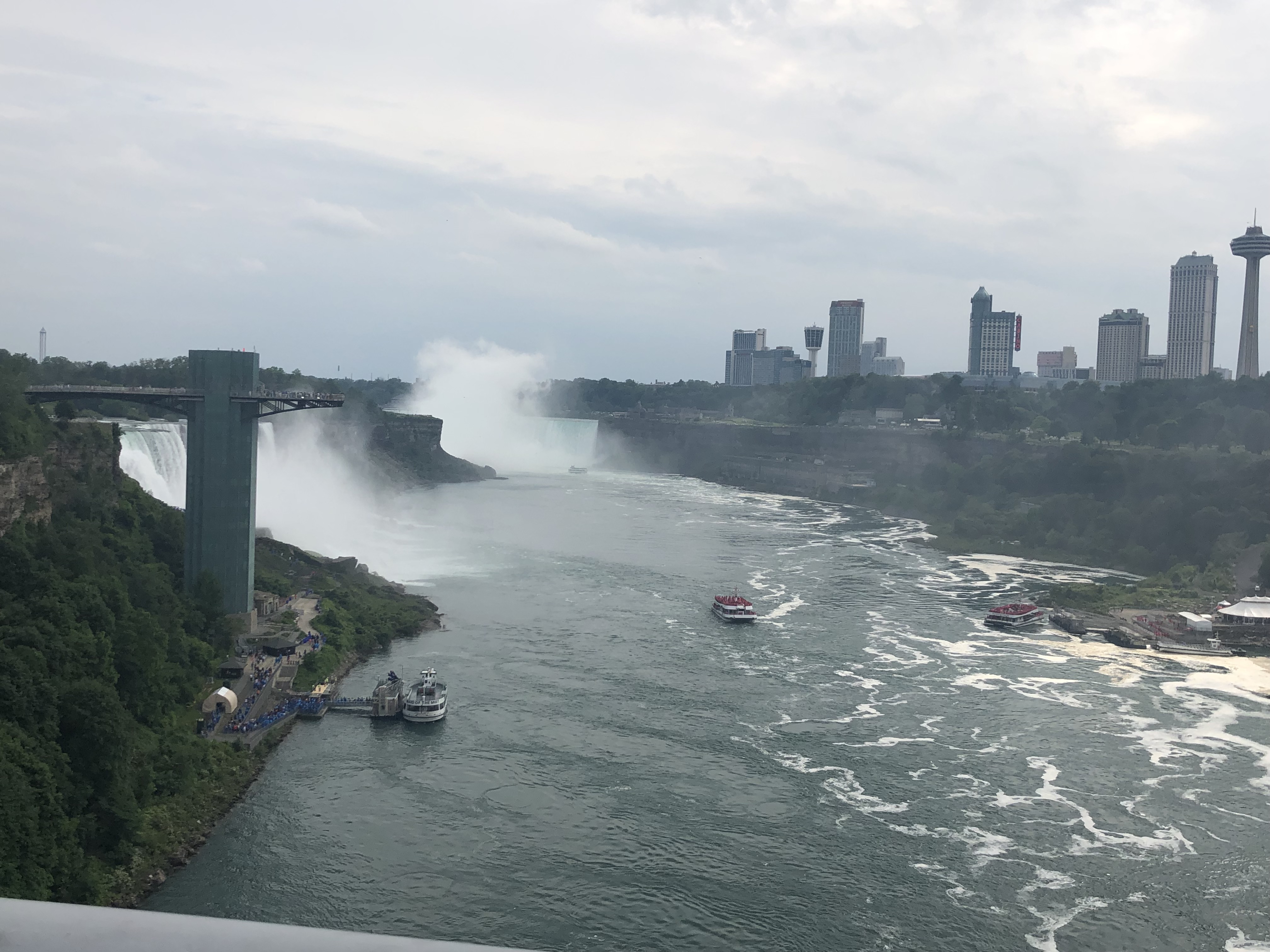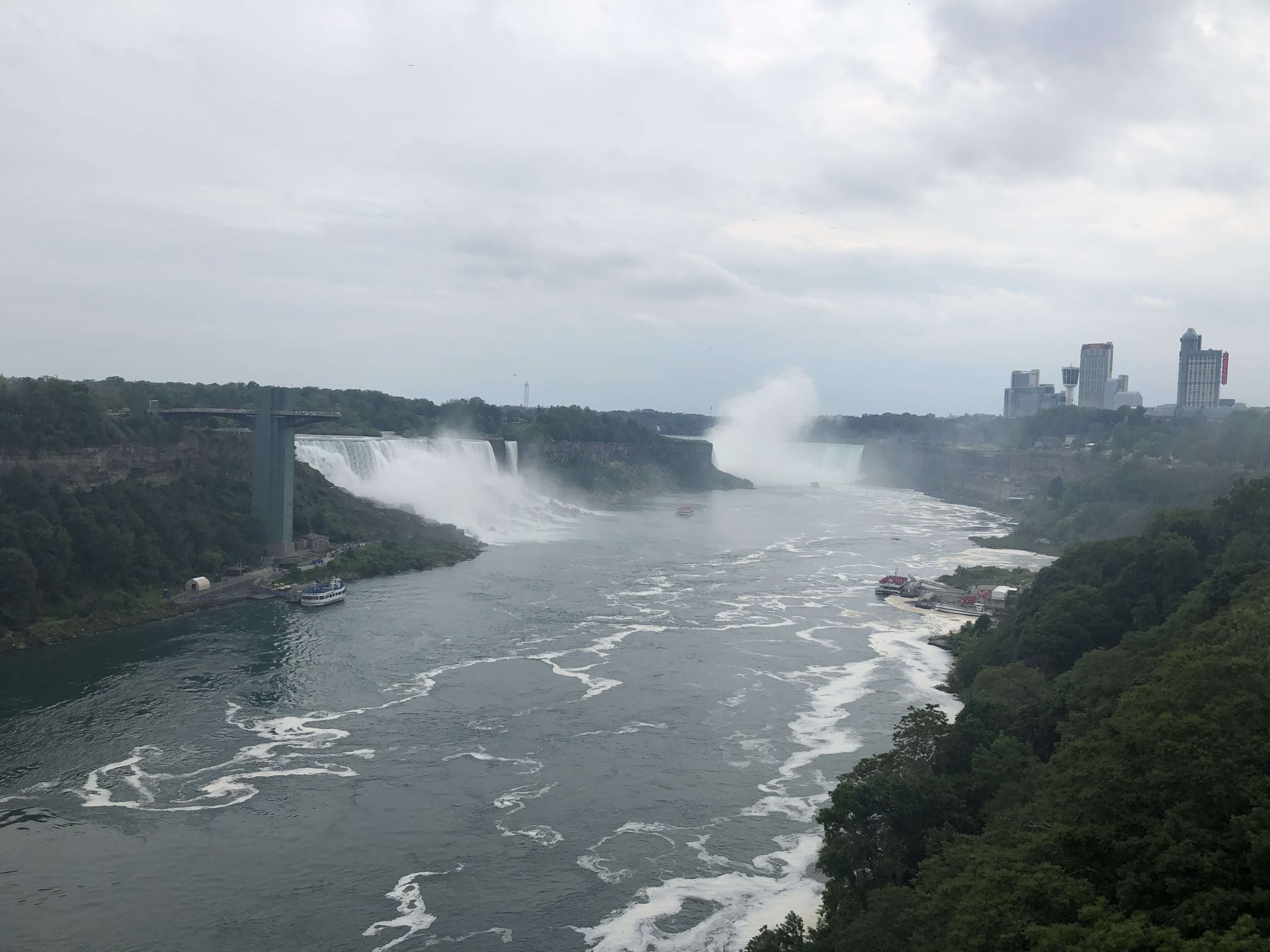 I loved Niagara Falls when we were there in 2016, but they were doing a lot of construction on the American side (Goat Island), and we weren’t able to see everything. We also drove across to the Canada side in 2016 to continue our trip. This time I wanted to walk across the Rainbow Bridge. I have to admit our travels are making me not quite as scared of heights as I used to be. It was pretty overcast when we arrived Wednesday afternoon, but the views were still spectacular. We walked to the Canada side, took the Maid of the Mist boat ride, and I walked up to the falls afterwards before we called it a night.